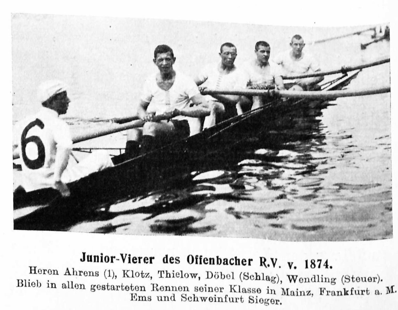 Beim Ruderverein von 1874 übt ein Junior-Vierer und ein Senior-Vierer, in dem die Herren Döbel und Klotz der bestbekannten, vorjährigen Juniormannschaft verblieben sind, während die beiden ausgeschiedenen Herren durch ältere Senioren Hoth und H. Müller, ersetzt sind. Die Mannschaft übt noch auf festen Sitzen und erscheint die Steuerbordseite etwas schwach gegenüber der sehr starken Backbordseite, aus beiden Mannschaften soll ein Achter zusammengesetzt werden.[…]