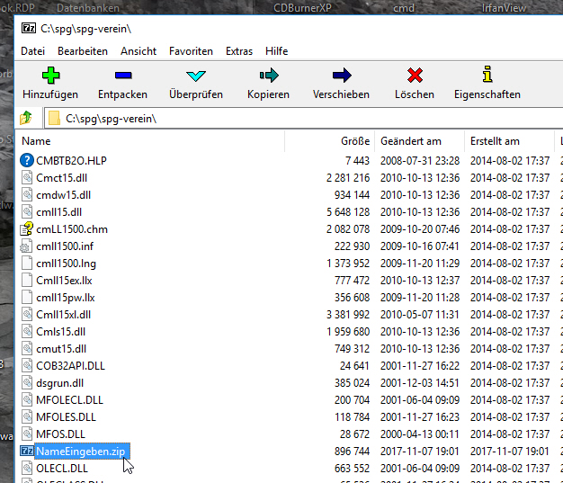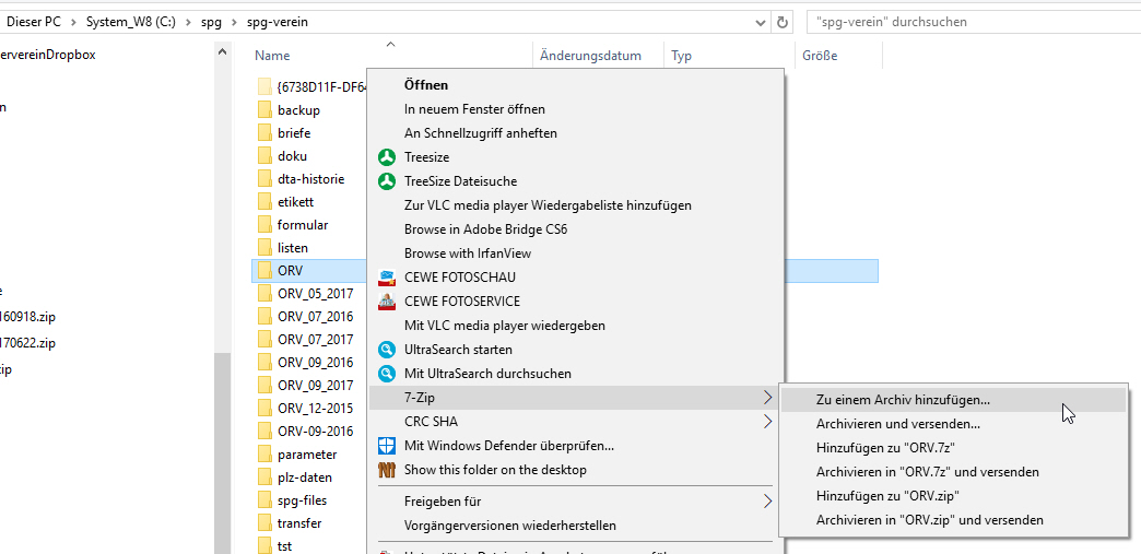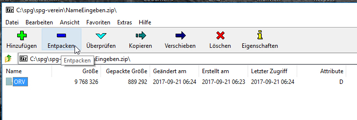 Den Order ORV mit den Mitgliederdaten aus dem SPG-Verein Verzeichnis mit Rechtsklick markieren und aus dem Kontextmenü 7-Zip > Zu