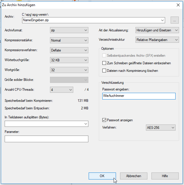 Als Archivformat zip Auswählen und der Datei einen Namen geben, sowie einen Ort, an dem Sie gespeichert werden soll. Unter dem Punkt Verschlüsselung ein Passwort vergeben (Dieses muss den Empfängern mitgeteilt werden, nach Möglichkeit nicht in der selben Mail wie die Verschlüsselte zip-Datei!